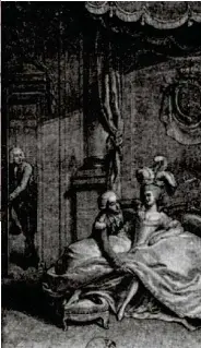 La nobleza inclinada forma un arco por el que camina la familia real. Llegan a la cámara nupcial. El rey de Francia en persona entrega el camisón al novio; la dama de mayor rango, la duquesa de Chartres, le entrega el suyo a la novia. El arzobispo de Reims bendice a la pareja y rocía el lecho con agua bendita. La corte se retira. Quedan los novios solos bajo el impresionante dosel. A continuación tiene lugar lo que Stefan Zweig llama 'invisible tragedia'.