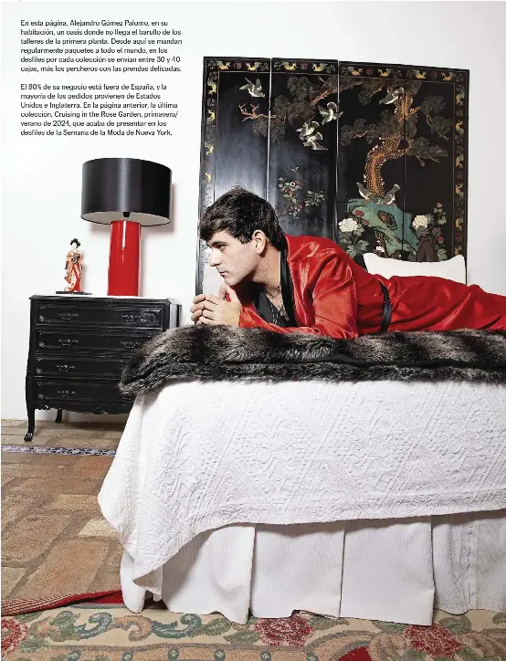 En esta página, Alejandro Gómez Palomo, en su habitación, un oasis donde no llega el barullo de los talleres de la primera planta. Desde aquí se mandan regularmente paquetes a todo el mundo, en los desfiles por cada colección se envían entre 30 y 40 cajas, más los percheros con las prendas delicadas.