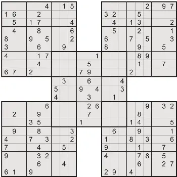 Rellene la cuadrícula de modo que todas las columnas, filas y cada recuadro de 3×3 contengan los números del 1 al 9. Los cuadros entrelazados le darán más pistas, a la vez que aumentan la dificultad.