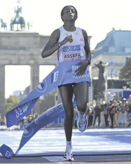 Pese a los reiterados intentos de los activistas del grupo ecologista Última Generación de interrumpir la carrera, el maratón de Berlín celebró ayer un nuevo récord mundial femenino con el triunfo de la corredora etíope Tigist Assefa (26 años), que rebajó la marca planetaria a 2 horas, 11 minutos y 53 segundos. Sólo medio centenar de hombres han sido capaces de correr más rápido esta prueba. Assafa, que es una recién llegada a esta especialidad, utilizó las zapatillas Adidas Adizero Adios Pro Evo 1, un modelo del que sólo se han fabricado 521 pares. Cada uno cuesta 500 euros y tiene una vida muy corta, unos 50 kilómetros de carrera. Es decir, sirve para un maratón. Pesan apenas 138 gramos y están diseñadas con espuma y carbono para provocar un efecto rebote. Sobre ellas, Assefa ha hecho historia en Berlín al recortar en más de dos minutos la plusmarca anterior (2:14:04).