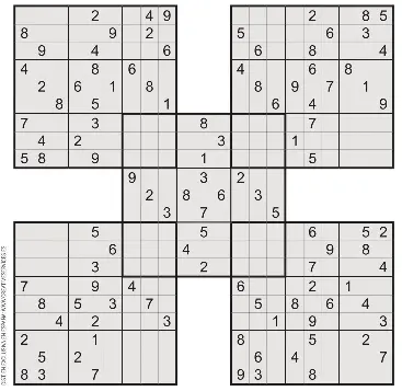 Rellene la cuadrícula de modo que todas las columnas, filas y cada recuadro de 3×3 contengan los números del 1 al 9. Los cuadros entrelazados le darán más pistas, a la vez que aumentan la dificultad.