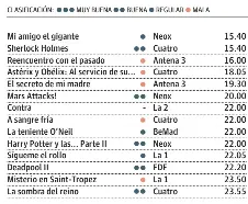 EE UU. 2016. 117 m. Fantástica. Director: Steven Spielberg. Intérpretes: Ruby Barnhill, Mark Rylance, Penelope Wilton, Jemaine Clement, Rebecca Hall. 15.40 NEOX. El maestro Steven Spielberg no acertó con esta adaptación a imagen real del cuento homónimo de Roald Dahl (la cinta animada, de 1989, es de Brian Cosgrove), que elimina intencionadamente sus aspectos más oscuros para poder llegar a toda la familia. Sus efectos especiales son de primer orden, pero la historia ni engancha ni fascina.